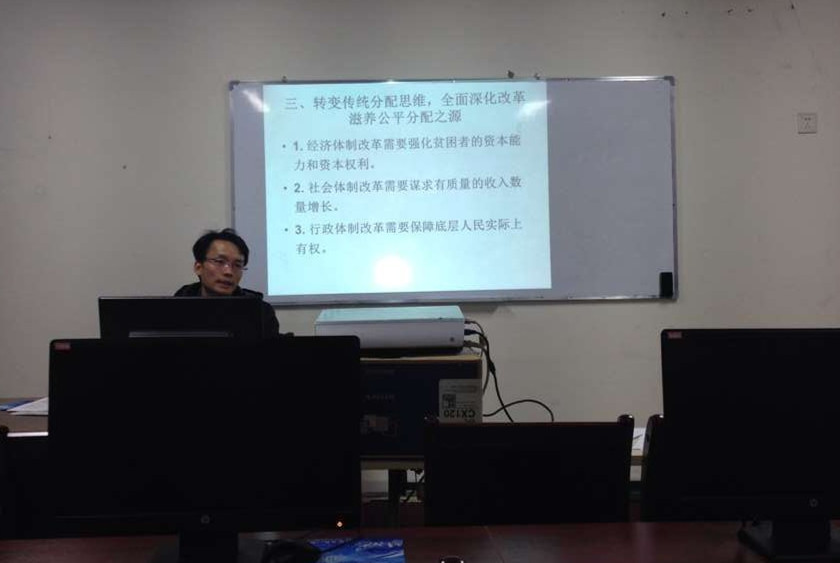 讲座过程中,李明桂博士从马克思公平分配思维的多重诉求、马克思公平分配思维遭遇的突出现实问题和转变传统分配思维,全面深化改革滋养公平分配之源等三个方面为大家讲解了马克思公平分配思维方面的知识。李明桂博士的讲座深入浅出,丰富了学生关于马克思公平分配思维方面的理论知识,现场气氛活跃,讲座取得了很好的效果。