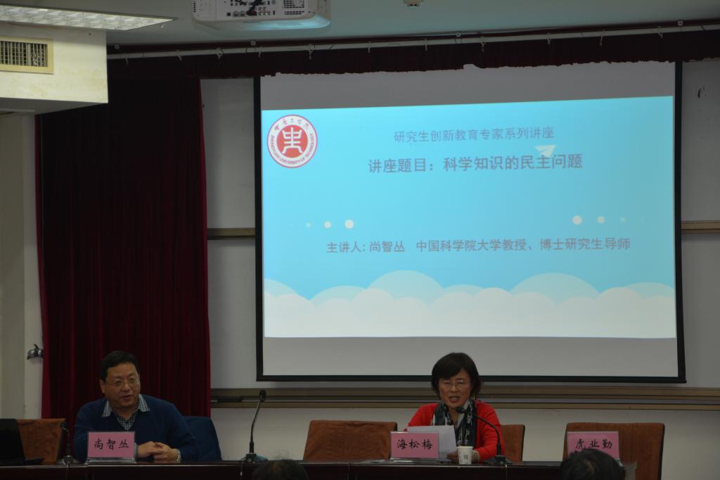 11 29 日下午, 4 号楼 311 学术报告厅,中国科学院大学尚智丛教授为我校研究生创新教育做了题为 科学知识的民主问题研究 的专题讲座。宣传部部长张东伟、研工部部长海松梅、WilliamHILL中国院长随新民、书记虎业勤、副院长柳素平及WilliamHILL中国全体教师参加讲座,全校一百多位研究生到场聆听。讲座由海松梅部长主持。