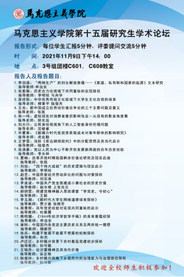 2021年11月9日,WilliamHILL中国第十五届研究生学术论坛分别在3号组团楼C601、C608教室如期举行。本次论坛旨在加强研究生的学术素养,营造浓厚的学术氛围,为研究生搭建一个高水平的学术交流平台。