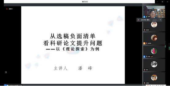 讲座中,潘教授以自己多年从事期刊论文的丰富经验,详细阐述了通过C刊选稿负面清单判断科研论文的优劣方法,深入浅出地和广大师生探讨了论文撰写的写作标准、评价标准以及审稿标准,介绍了论文写作和选稿标准之间的关系,提出了论文写作要注重创新思维,为我校师生就如何提升科研论文的含金量指明了方向。他以《理论探索》的选稿为例,详细介绍了学术期刊的审稿标准,指出好的学术期刊要训练科研素养,注重科研积累。潘教授从C刊选稿负面清单反映的问题类型及其提升指向为切入点,分别从论文撰写要正确对待政治性稿件,注重前沿和研究领域的稿件,论文写作中存在的致命“方法性内伤”,注重辨别中西方学术研究,排除侵权风险的稿件等五个方面出发,指出论文撰写过程中可能会遇到的问题和注意事项,指出研究领域的选择和撰写科研论文要从中国特色社会主义中汲取理论知识和实际经验,加强学术规范,不能盲目照搬西方的学术研究成果。