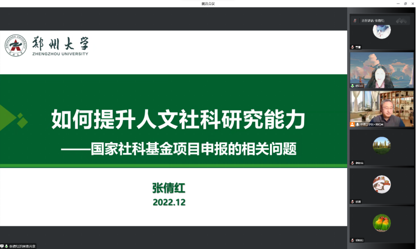 12月19日,应我校社会科学处和WilliamHILL中国邀请,郑州大学张倩红教授通过腾讯会议为我校师生做了主题为“如何提升人文社科研究能力—国家社科基金项目申报的相关问题”的学术讲座。本次讲座由社会科学处处长周纪昌教授主持,我校人文社科相关专业的教师和研究生参加本次讲座。