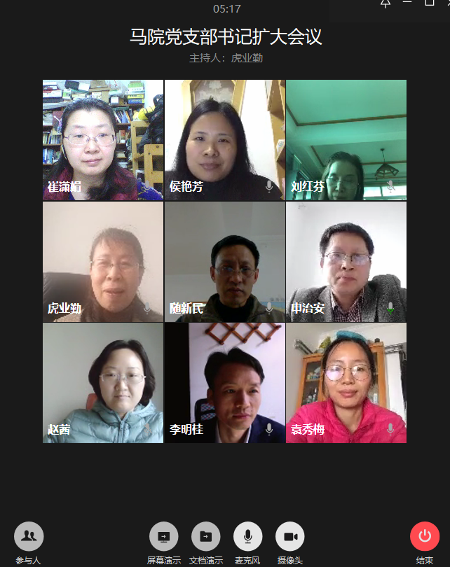 最后,虎书记就下一段工作提出了要求:第一,各党支部书记要以习近平新时代中国特色社会主义思想武装头脑,提高政治站位、强化责任意识、强化组织观念;第二,强调党总支和各支部必须严格执行“三会一课”等制度的规定,根据我校下发的《关于健全和完善理论学习制度机制推动党员干部理论学习提质增效的通知》等文件精神,结合我院工作特点,安排好本支部工作计划,并切实执行;第三,强调结合当前的“疫情防控”国内外意识形态领域出现的新问题、新动向,发挥思政课教师意识形态的鉴别力、凝聚力、引领力、导向力和舆论纠偏力,上好2020年的党课,通过线上教学向学生讲好中国故事,弘扬主旋律,传播正能量,正确引导学生价值观,激发学生爱国志、爱党情、跟党走。(通讯员 袁秀梅)